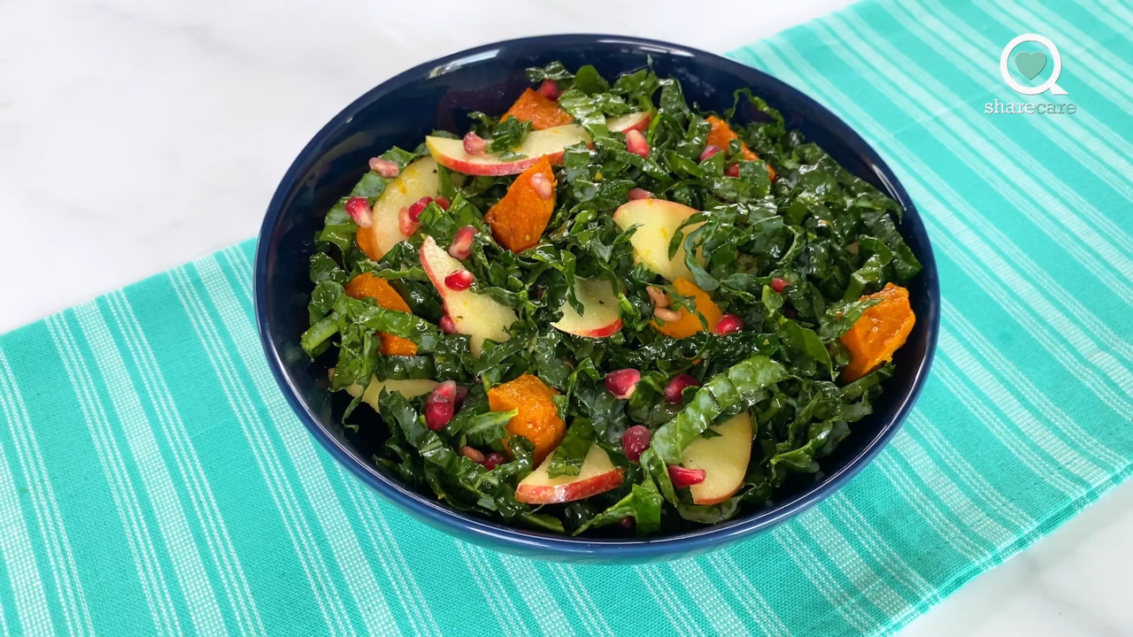 This hearty kale bowl features butternut squash, apple, and pomegranates.